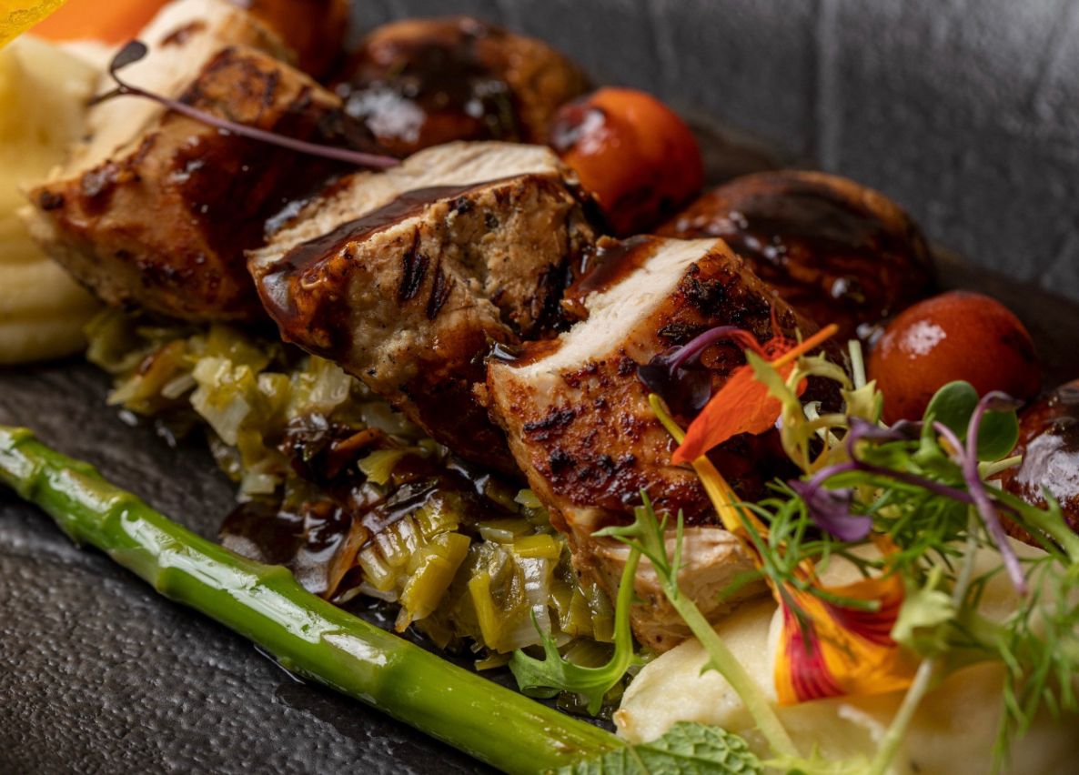 Grilled Chicken Fillet with caramelized leeks, mushrooms, cherry tomato, fresh thyme juice