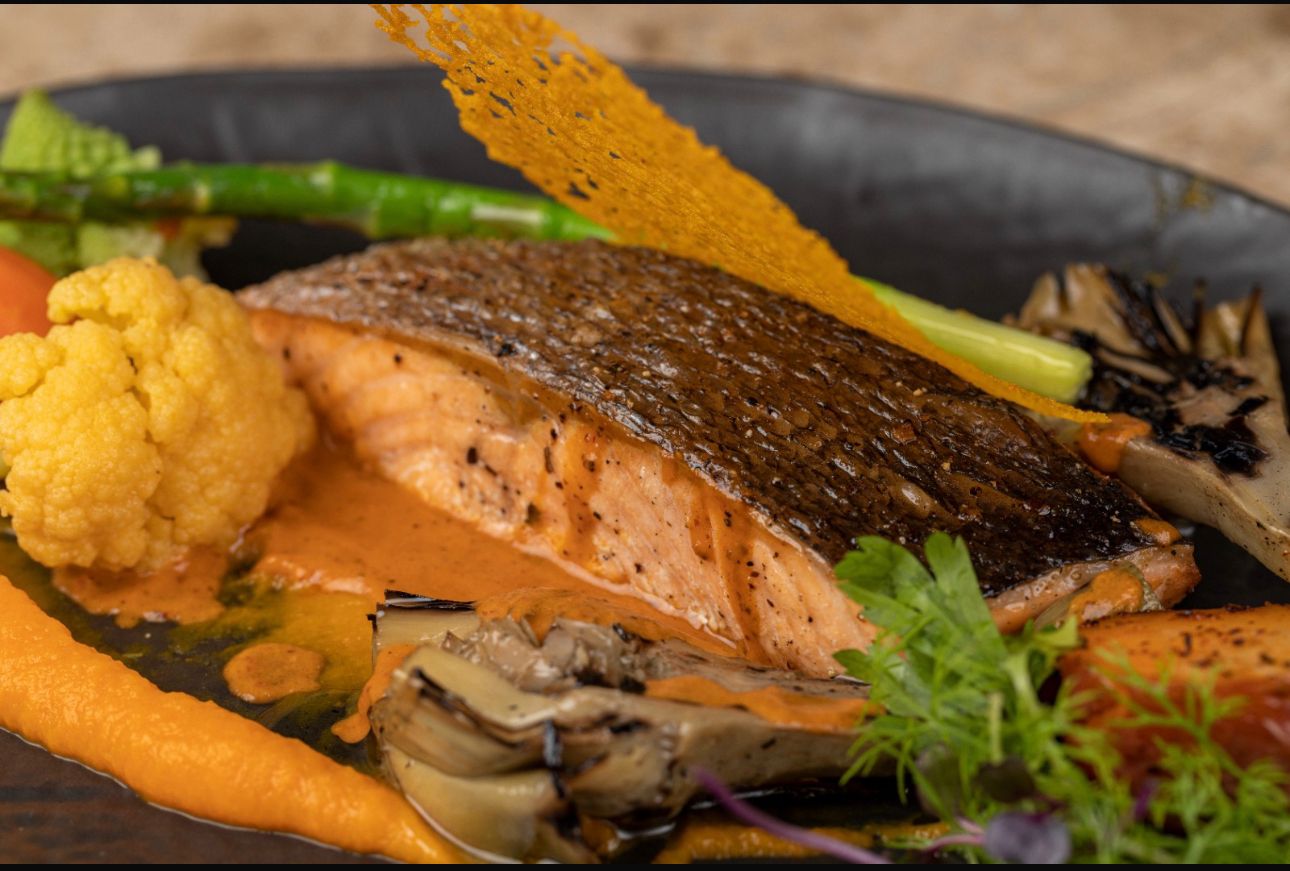 Beautiful darn salmon served with pink berries sauce, purple cauliflower & glazed artichoke